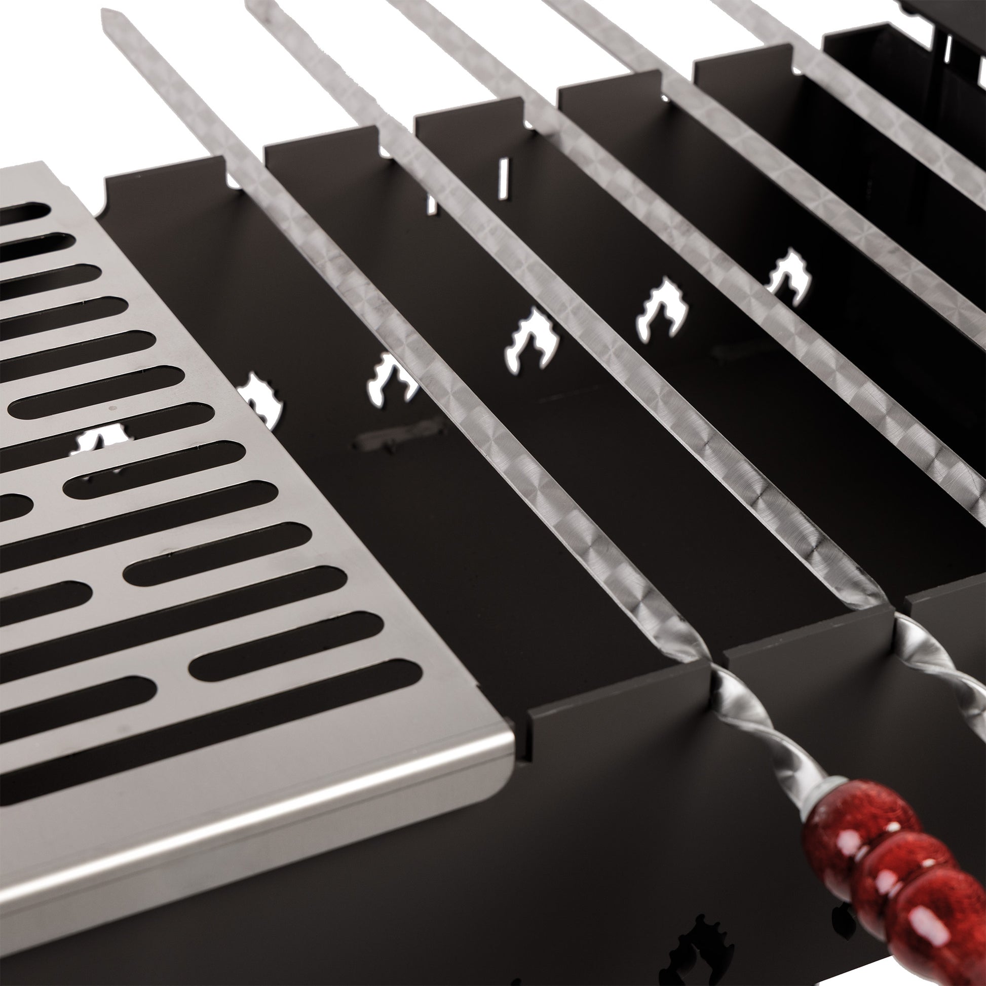 This stationary grill, made from high-quality 4 mm thick steel, is the perfect solution for outdoor barbecue enthusiasts. Designed to accommodate 15 skewers, the model features folding legs, making it easy to transport and store—ideal for both home use and outdoor trips.