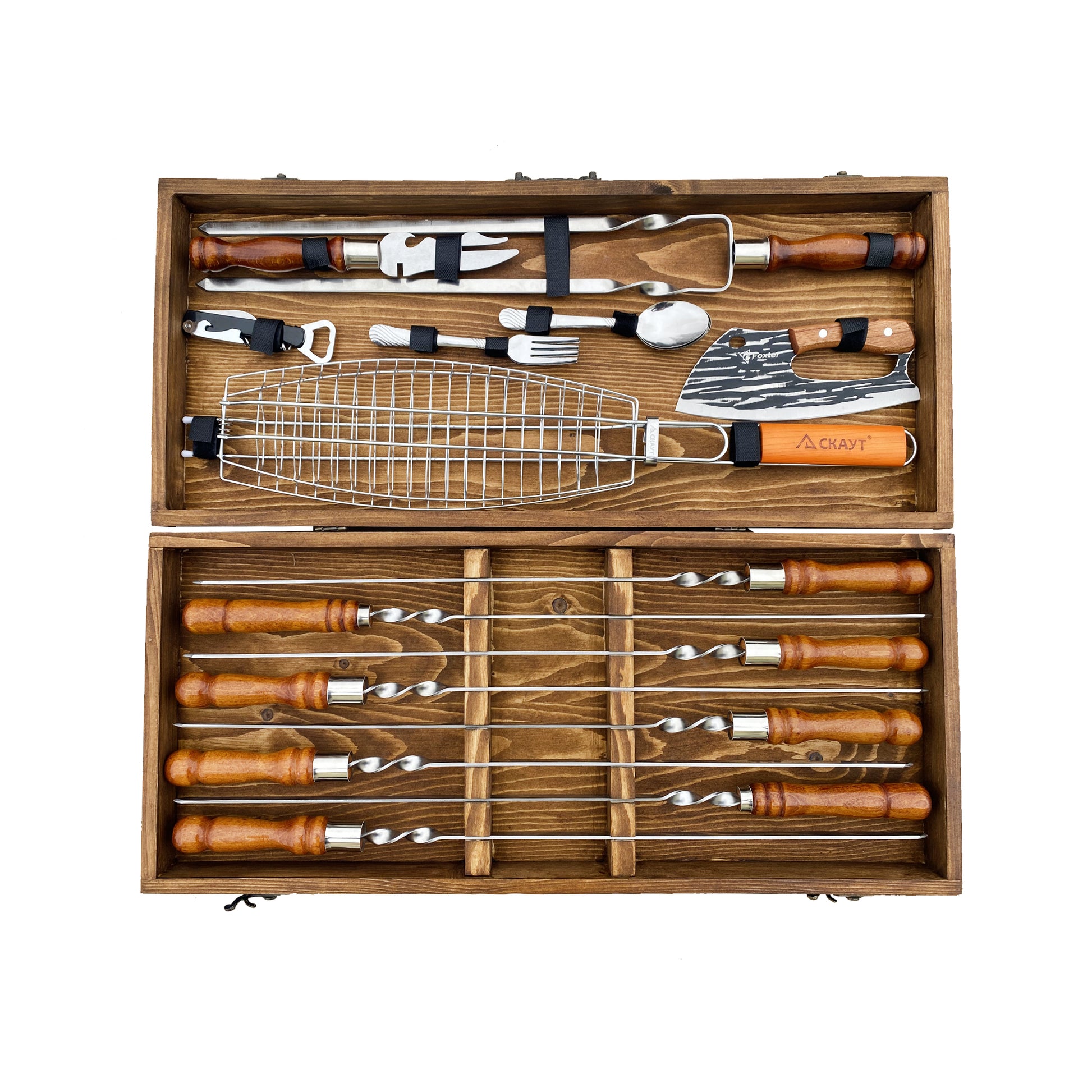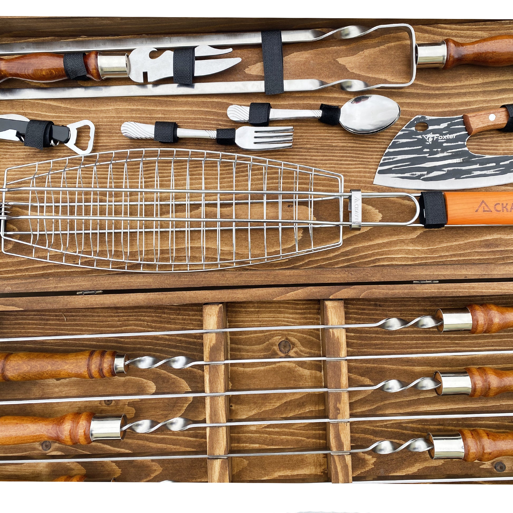 Zestaw premium " BrownCraft " dla 6 osób – 25 elementów: 8 szpikulców, 6 widelców, 6 łyżek, nóz do mięsa, podwójny szpikulec. Nóż–widelec do zdejmowania mięsa, otwieracz, ruszt do ryb. Drewniane etuiKomplet zawiera wszystko, czego potrzeba, aby przygotować wygodne i w pełni wyposażone przyjęcie przy grillu — w domu, ogrodzie czy na pikniku.