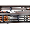 Każdy element ma swoje wyznaczone miejsce w futerale, dzięki czemu zestaw jest zawsze poukładany, łatwy w transporcie i wygodny do zabrania na działkę czy w plener. Szpikulce wykonano z wytrzymałej stali nierdzewnej — są solidne, mają wygodne uchwyty i bez problemu radzą sobie z wysoką temperaturą. Podwójny szpikulec stabilnie trzyma cięższe kawałki mięsa, a nóż–widelec pozwala szybko zdjąć je z ognia bez ryzyka poparzenia.