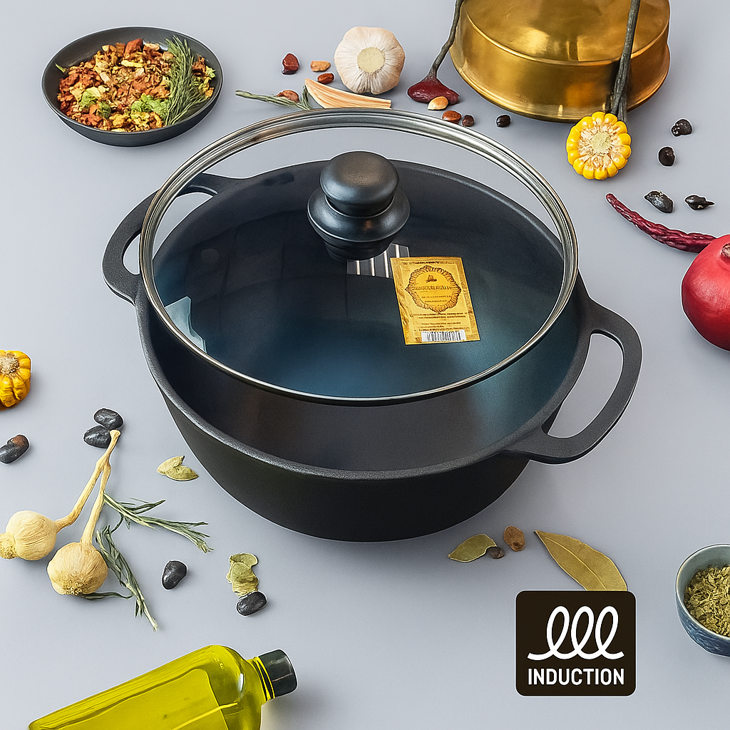 Żeliwny kociołek 5 L ze szklaną pokrywką – Tradycyjny smak w nowoczesnym wydaniu